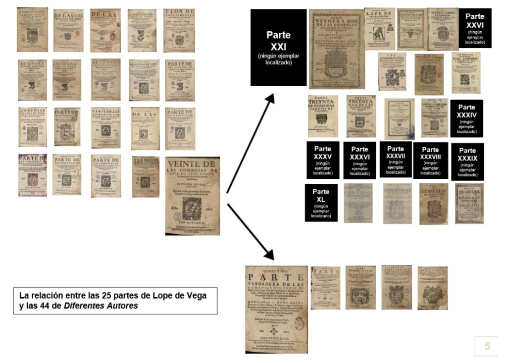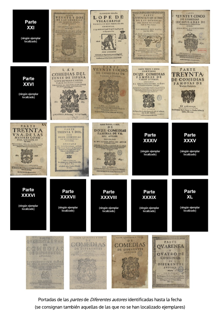 Las partes «oficiales» de Lope son 25, publicadas entre 1604 y 1647. El grupo PROLOPE, que fundara Alberto Blecua en la Universitat Autònoma de Barcelona, está editando críticamente sus comedias, siguiendo el orden de esas partes23. Cada volumen dedica un estudio detallado a las condiciones editoriales y bibliográficas de la parte correspondiente. Ese conjunto de apartados constituyen un valioso material para el conocimiento del mundo editorial de Lope y del fenómeno general24.