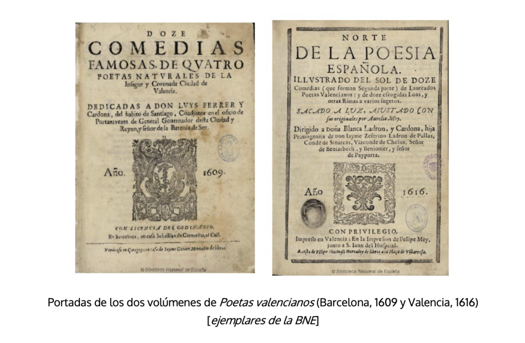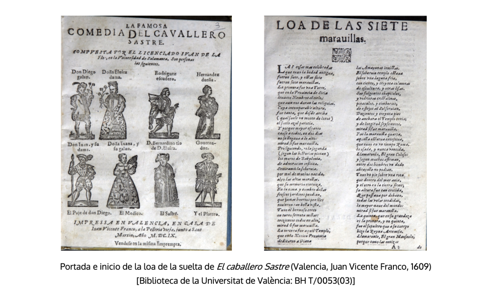 Aunque los primeros años parecen estar dominados por el formato de parte, no faltan otros especímenes tempranos de sueltas, anteriores a la gran proliferación que se produjo a mediados de los años veinte coincidiendo con la suspensión de licencias en el reino de Castilla, y sobre los que no parece que se haya prestado atención, por lo que nos detendremos en ellos algo más de lo que conviene a una síntesis. Son tres los localizados, impresos en Valencia, la otra gran ciudad del oriente peninsular, que gozaba de un dinamismo cultural y teatral notables desde la centuria anterior, y de la que también se ha destacado su actividad innovadora en la impresión teatral (Cruickshank 2017, 145). El más antiguo lleva en el encabezamiento La famosa comedia del Caballero sastre, compuesta por el Licenciado Juan de la Flor, en la Universidad de Salamanca. Asimismo, hace constar en la parte inferior de la portada que «fue impresa en Valencia, en casa de Juan Vicente Franco, a la Pellería Vieja, junto a Sant Martín, año de M.DC.IX. Véndese en la misma emprempta». Lleva al comienzo la Loa de las siete maravillas. Solo conozco el ejemplar de la Biblioteca de la Universidad de Valencia, al que muy probablemente le faltan de la página 43 a la 48. Consta de dos pliegos de doce hojas, con la signatura tipográfica marcada en las siete primeras: A-B12?. En las dramatis personae de la portada, y como ilustrando a los nombres de los personajes, hay ocho grabados, a la manera que harán, aunque en menor medida, las dos partes de poetas valencianos (1609 y 1616). El impresor Juan Vicente Franco está atestiguado en la capital del Turia de 1608 a 1624 y en Orihuela de 1626 a 1669 (Casado 1996, 245-246). Nada más allá de la referencia a esta obra dicen de Juan de la Flor los catálogos de La Barrera (1969, 161) y Urzáiz (2002, 322).