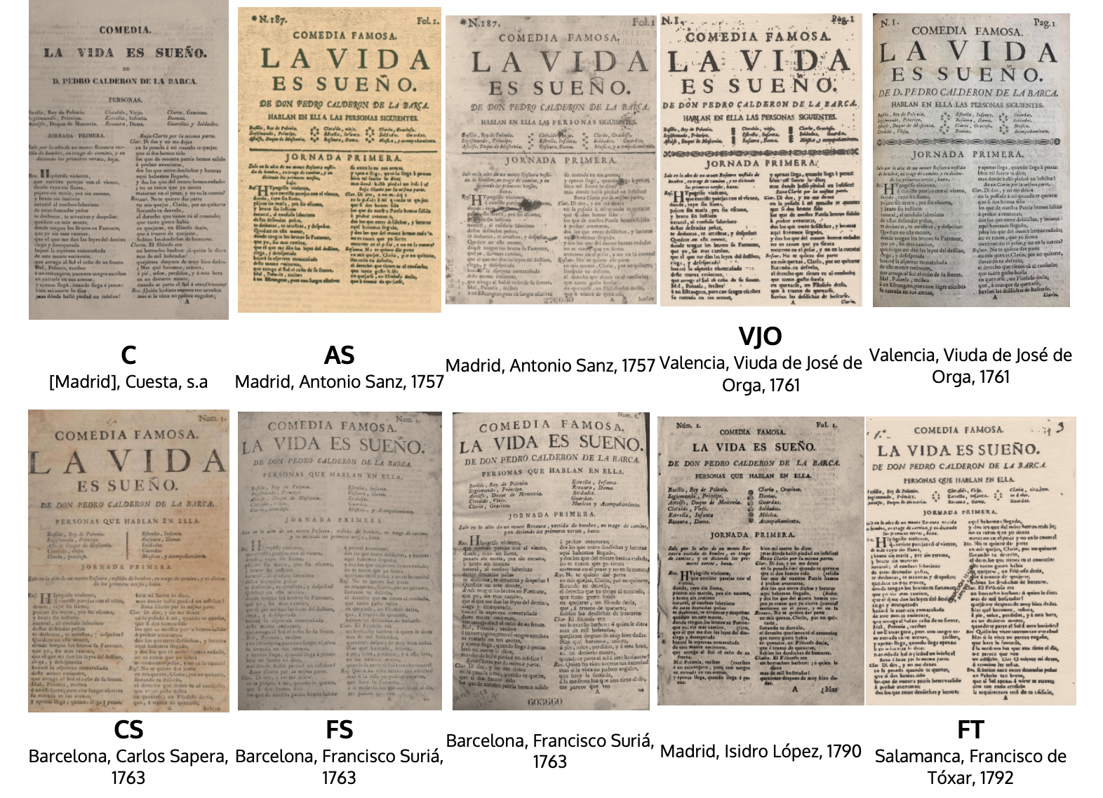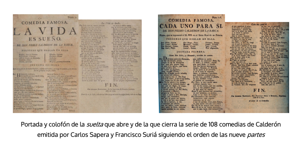 Las partes de comedias de Calderón fueron objeto de proyectos editoriales dieciochescos de dispar rigor y legalidad Moll 1983). Las nueve de Vera Tassis se reeditaron en Madrid entre 1715 y 1731 y dieron pie a los once tomos de la edición de Fernández de Apontes (1760 y 1763). Una empresa menos ortodoxa fue la conocida como pseudo-Vera Tassis, consistente en emular los tomos auténticos mediante la recopilación de ediciones sueltas, de la que debió de ser responsable la librería madrileña de los Herederos de Gabriel de León, a principios del siglo XVIII. Sin afán de engaño, pero también con las sueltas como soporte, los libreros barceloneses Carlos Sapera y Francisco Suriá publicaron a partir de 1763 las 108 comedias de las nueve partes de Vera Tassis (Moll 1971)34.