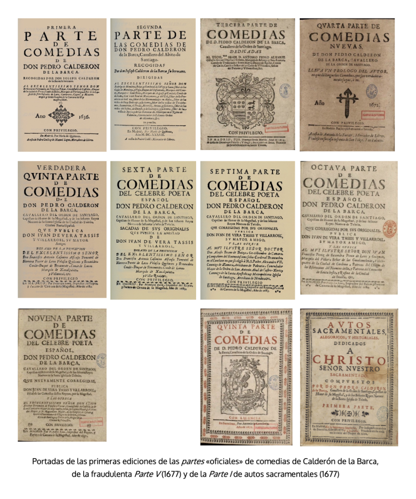 La historia editorial «oficial» del teatro de Calderón se inicia en 1636, en que ve la luz la primera de las nueve partes que constituyen su legado principal. Hacía poco que se habían reanudado las concesiones de licencias para imprimir literatura de ficción en el reino de Castilla, tras la suspensión de diez años, y el dramaturgo vivía un momento de éxito en los corrales y en la corte, donde era reconocido con el hábito de la orden de Santiago. Su interés por la publicación de esa Parte I y de la II al año siguiente tendría que ver con su voluntad de autoafirmación, al tiempo que de reivindicación de la autoría de comedias que habían aparecido fraudulentamente a nombre de Lope de Vega. Aunque de la publicación se responsabilizó «oficialmente» su hermano José, detrás estaría el propio dramaturgo, como indica que fuera él quien pidiera las licencias y los privilegios correspondientes30. A pesar de que en la dedicatoria al Condestable de Castilla de la Parte I se declara que la razón de publicarlas es «el pesar de haber visto impresas algunas dellas antes de ahora, por hallarlas todas erradas, mal corregidas, y muchas que no son suyas en su nombre, y otras que lo son en el ajeno», lo cierto es que tanto esta parte como la II ponen de manifiesto que las copias con que se hizo para algunas de las obras eran claramente mejorables y que él, por falta de tiempo o por desinterés, no las mejoró31. En vida del poeta aparecieron otras tres partes. Las cinco tuvieron, a su vez, diferentes reediciones: Parte I (1636, 1640 y ‘1640′), Parte II (1637, ‘1637′ y 1641), Parte III (1664 y ‘1664′), Parte IV (1672 y 1674) y la desautorizada Parte V (1677 y 1677)32. Este último volumen enfadó a Calderón especialmente, como manifiesta en el prólogo del primer volumen de sus autos (1677), publicado en esa fecha. A pesar de que en la descalificación dice «no ser las cuatro mías», hoy sabemos que todas son suyas menos El rey don Pedro en Madrid, que sería de Claramonte33. La última en reconocérsele ha sido Cómo se comunican dos estrellas contrarias (Vega 2005).