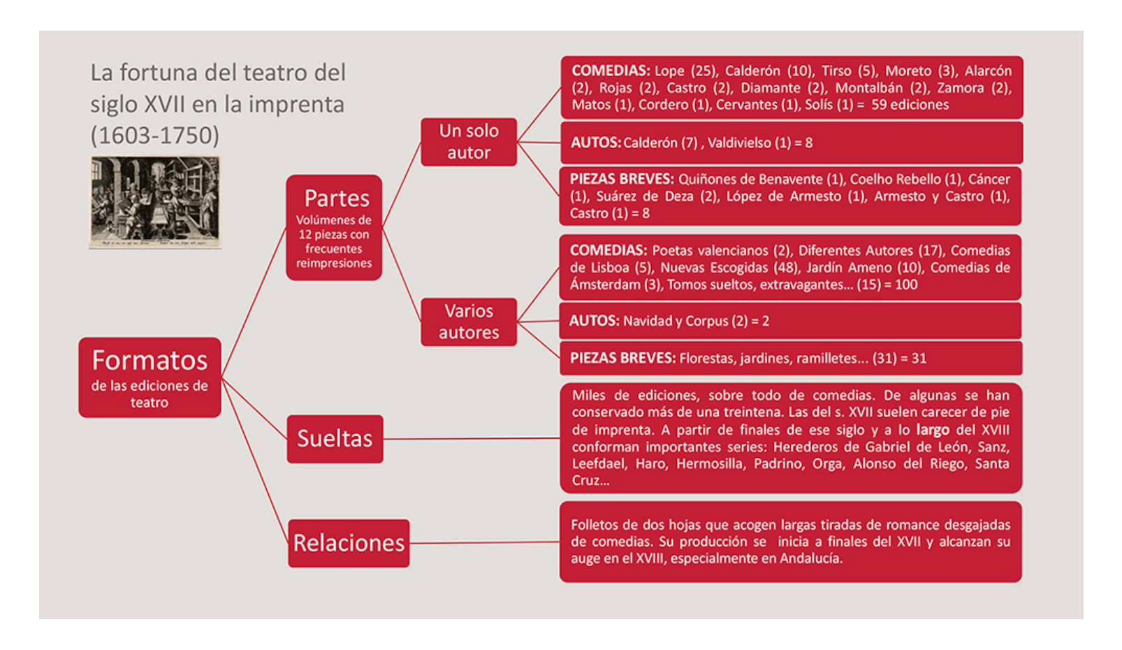 Entre noviembre de 2017 y marzo de 2018 se programó en la BNE la que posiblemente haya sido la exposición más importante sobre el género en estos años que interesan, con el título «Lope y el teatro del Siglo de Oro». En ella se quería reflejar las claves de esta manifestación y su pervivencia hasta hoy, en los escenarios y como objeto de estudio. Una de sus secciones llevaba por título «El teatro también se lee. De las tablas a las prensas», y en ella se ofrecían ejemplares de los distintos formatos. Todo presidido por un mural con el esquema general de la producción impresa, que utilizaremos más adelante, como frontispicio de los apartados que se dedican a cada tipo de impreso10.