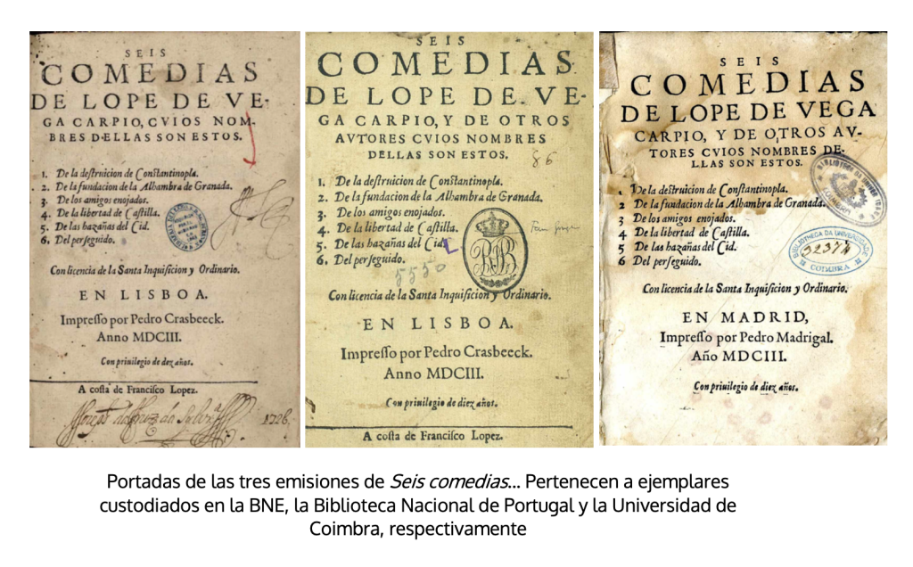 El primer paso conocido se dio bajo la fórmula agrupada14. Lo constituye un volumen fechado en 1603 del que se han localizado tres emisiones diferentes con los títulos alternativos de Seis comedias de Lope de Vega Carpio o Seis comedias de Lope de Vega Carpio y de otros autores, al igual que los pies de imprenta en los que se atribuye a Pedro Craesbeeck en Lisboa o a Pedro Madrigal en Madrid. Así pues, arranca la trayectoria impresa de la fórmula nueva con un enigma bibliográfico, que de alguna manera está anunciando la complejidad de las relaciones entre teatro e imprenta. Sobre él se han pronunciado desde el propio Lope a los diferentes bibliógrafos especialistas en la materia. Hoy puede considerarse que el nudo está deshecho en lo fundamental, gracias al reciente trabajo de Luis Iglesias: «Todos los ejemplares descritos, sin excepción […] presentan los mismos errores en la signatura y la foliación. Por lo tanto, es absolutamente seguro que se trata de una única edición, lo que también confirma la coincidencia en las numerosas erratas del texto, los abundantes lusismos y, en fin, la alteración del orden en que se editan las comedias respecto al que se anuncia en las portadas» (Iglesias 2013, 726). Todos habrían salido del taller lisboeta: