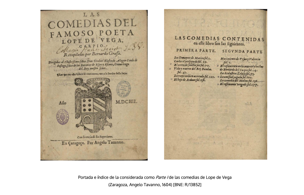 Al año siguiente, en 1604, aparecía el libro Las comedias del famoso poeta Lope de Vega Carpio, recopiladas por Bernardo Grassa, considerado como la Parte I del dramaturgo e inicio ya claro de una prole numerosa de volúmenes del mismo escritor y de otros16. A partir de aquí, salvo raras excepciones, la docena se habría de erigir en unidad de medida de la parte de comedias. Es decir, el doble que el tomo de 1603; lo que no parece fortuito: la edición princeps de la Parte I (Zaragoza, 1604) consta, en realidad, de dos secciones diferenciadas tipográficamente de seis comedias cada una. Solo a partir de la edición de Valladolid de 1604 se ofrecen como un bloque conjunto17.