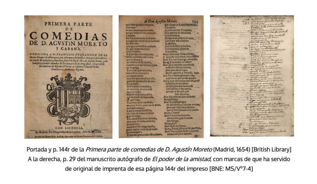 Tres son las partes de la colección particular de Agustín Moreto, uno de los dramaturgos más leídos en la segunda mitad de XVII y durante la centuria siguiente. La primera, en 1654, con responsabilidad del dramaturgo, que se dedicó con esmero a su publicación. Gracias al excelente estudio de Miguel Zugasti (2008), conocemos detalles de interés sobre cómo el dramaturgo se hizo con los textos de unas comedias escritas no muchos años antes (probablemente entre 1648 y 1653), solicitándolos de sus poseedores en esos momentos. Se conserva un documento de septiembre de 1654 por el que el dramaturgo compra a Damiana de Arias y Peñafiel, viuda del autor de comedias Gaspar Fernández de Valdés, los derechos de varios manuscritos, entre los que está el de El desdén con el desdén, para poder publicarlos en el volumen. Otro de los manuscritos que debió de recuperar para ese mismo destino, en este caso del autor de comedias Diego de Osorio, fue el autógrafo de El poder de la amistad, que además presenta la peculiaridad de haber servido de «original de imprenta» para esta Parte I, como delatan algunas marcas inequívocas. Moreto debía de tener prisa en que apareciera el volumen para hacer frente a la publicación unos meses antes de la Parte VII de Nuevas escogidas, que contiene tres de las comedias de esa Parte I.