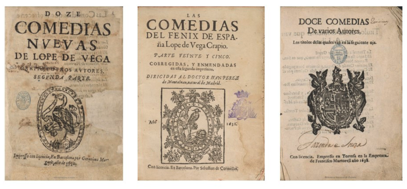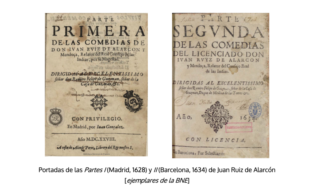 Las de Juan Ruiz de Alarcón estuvieron también al cuidado del dramaturgo. La Parte I apareció en 1628, en pleno periodo de suspensión de licencias en el reino de Castilla (2625-1634), como acusa Lope de Vega en su epistolario: «Las Comedias de Alarcón han salido impresas: solo para mí no hay licencia»; lo que se explica por haberla obtenido con anterioridad: las aprobaciones y el privilegio están firmados entre enero y marzo de 1622. Otra peculiaridad es que solo contiene ocho comedias, como el volumen que imprimió Cervantes en 1615. La Parte II fue publicada en Barcelona, por Sebastián de Cormellas, casi con toda seguridad para evitar la suspensión de licencias del reino de Castilla, justo el mismo año en que estas volvían a activarse. Tal circunstancia habría sugerido solicitar una nueva aprobación para legalizar su difusión en Castilla, firmada en Madrid el 9 de agosto de 1634, y que, junto con una nueva suma de la tasa, el 22 de agosto de 1634, se imprimió en una hoja añadida tras la portada38.