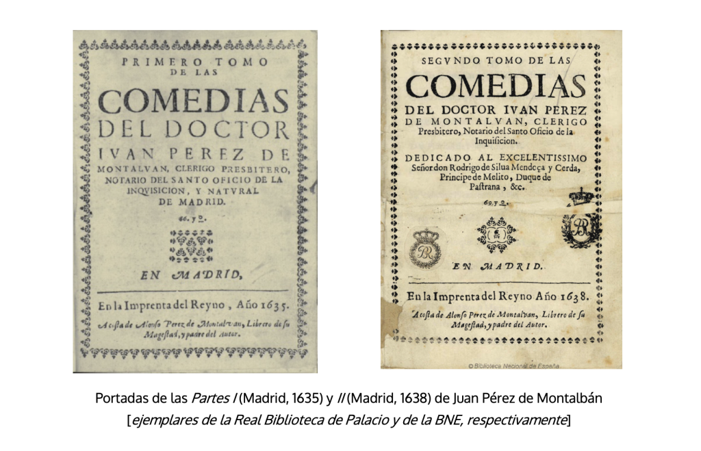 Las dos partes de Juan Pérez de Montalbán fueron estampadas en la Imprenta del Reino y costeadas por su padre, el librero Alonso Pérez de Montalbán. La I en 1635, el mismo año que otros colegas dramaturgos, en esa explosión editorial que sobrevino con el fin de la suspensión. La II en 1638, ya póstuma, pues el escritor había muerto poco antes, como evocan los paratextos. Es su padre quien la promueve, solicita el privilegio y escribe una conmovida dedicatoria a don Rodrigo de Silva. Como ya adelantó Dixon (1961), serían varias las obras de este volumen que no son del dramaturgo39: Amor, lealtad y amistad, publicada antes como obra de Sebastián Francisco de Medrano; El divino portugués, San Antonio de Padua se atribuye en un manuscrito a Bernardino de Obregón; y El sufrimiento premiado, que es de Lope de Vega, y a su nombre la editó Dixon; atribución que da por buena la estilometría (Vega 2023)40.