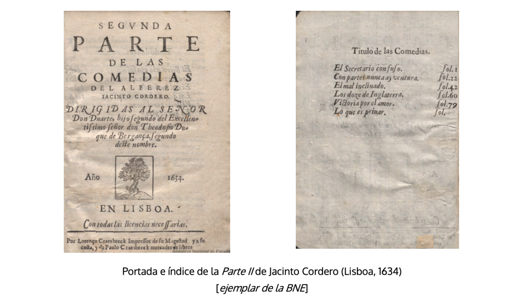 El portugués Jacinto Cordero (o Cordeiro) también debió de publicar dos volúmenes de sus comedias, de las que solo nos ha llegado la Parte II (Lisboa, Lorenzo Craesbeeck, 1634), con la particularidad de que solo contiene seis piezas. En su prólogo dice haber publicado una Parte I, que rápidamente se agotó en distintos reinos donde se publicó sin solicitarlo, y apunta la publicación de una Parte III con otras seis comedias. De la supuesta Parte I no conozco ningún ejemplar. Dice sobre ella La Barrera (1969, 100): «Comedias… (Colección de las suyas, no citada por los bibliógrafos, de la cual posee un fragmento el señor don Agustín Durán, comprensivo de las páginas 1.ª a la 95, y en ellas de las siguientes piezas): El Hijo de las batallas. Representóla Manuel Simón. Con partes, nunca hay ventura. Representóla Avendaño. El mal inclinado. Representóla Tomás Fernández. Los Doce de Inglaterra. La victoria por el amor. Este tomo hubo de imprimirse en Valencia, según afirma García de Villanueva, Hugalde y Parra en su Origen del teatro español, 1804». La Barrera, sin embargo, no parece conocer la Parte II; de haberla visto, hubiera comprobado que salvo la primera, las otras cuatro comedias coinciden, y en el mismo orden, con las que van de la segunda a la quinta en esa Parte II. Por otro lado, dicho fragmento hoy no está localizado en la BNE, donde fueron a parar por adquisición en 1863 los fondos de Durán. Y aunque lamentablemente fue práctica de la BNE separar las piezas componentes de los tomos, tampoco se encuentran las comedias por separado (excepto, quizá, la titulada Con partes nunca hay ventura).
