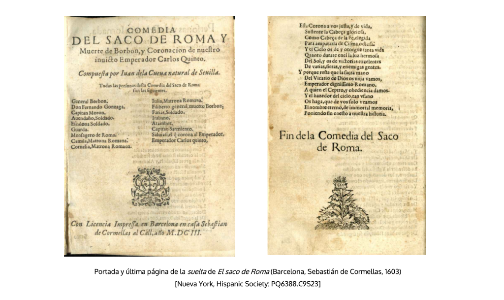 20J. P. W. Crawford, The 1603 edition of Juan de la Cueva’s Comedia del saco de Roma, «Modern Language Notes», 44, 1929, p. 389. El único ejemplar localizado, al que pertenece la portada copiada, se encuentra en la Hispanic Society of New York. En 1609 Cormellas publicó otra rareza bibliográfica, el entremés del Testamento del pícaro pobre (González Cañal, R., «Un entremés olvidado de principios del siglo XVII: el Testamento del pícaro pobre de Damón de Henares», Bulletin of the Comediantes, 45, 1993, pp. 277-309.), que supone también el inicio del entremés suelto, tipo que se quedará muy lejos en número del alcanzado por la comedia.