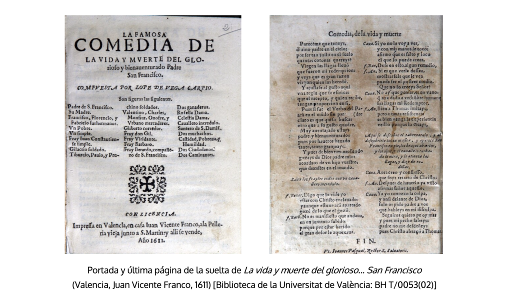 Los otros dos impresos valencianos ofrecen textos que se atribuyen al más relevante de los dramaturgos del momento, Lope de Vega. La más antigua es La famosa comedia de la vida y muerte del glorioso y bienaventurado padre San Francisco, compuesta por Lope de Vega Carpio, e impresa en el mismo taller de Juan Vicente Franco en 1611. Está formada por tres pliegos 4º, A-B8,C6. Lleva al frente la loa de Las cuatro edades del mundo de Agustín de Rojas. Hace constar la licencia en la última página («Vt. Ioannes Pasqual, Rector S. Saluatoris»), lo que será raro en la sueltas de lo que resta de siglo, a pesar de la obligación que el Consejo de Castilla recuerda en 1627 de que también los ephimera la lleven. Estamos ante un caso más de atribución espuria al Fénix. La comedia tiene cuatro actos y una métrica que obligan a que Morley y Bruerton nieguen su paternidad: «Probablemente fue escrita hacia 1580 por un dramaturgo de segunda fila» (1968, 580-581). Tampoco el análisis estilométrico llevado a cabo en ETSO (28/09/2024) le concede la más mínima posibilidad, aunque sí apunta con claridad su escritura temprana (Cuéllar y Vega 2017-2024).