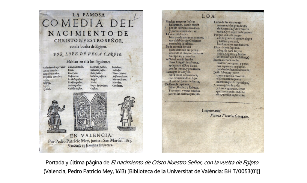 El tercer impreso corresponde a La comedia famosa del Nacimiento de Christo Nuestro Señor, con la vuelta de Egipto. En la parte inferior de la portada se lee: «En Valencia, por Pedro Patricio Mey, junto a San Martín, 1613. Véndese en la misma emprenta». El impresor es uno de los más notables y de larga trayectoria en el negocio librero valenciano, con mucha producción en su haber entre 1582 y 1623, en la que cuentan obras de Lope, como La Dragontea, y de Cervantes, como el Quijote y el Persiles. En la última página figura también la licencia de impresión: «Imprimatur, Vitoria Vicarius Generalis». Se compone de tres pliegos 4º: A-B8,C6. Su texto es diferente al de la comedia que con el primero de los títulos se publicó en la Parte XXIV (1641). Sobre la autenticidad de su atribución se han pronunciado Morley y Bruerton, y, aunque la clasifican entre las «dudosas», sí se muestran proclives a aceptarla: «La comedia puede ser posiblemente [sic] El nacimiento de P[eregrino]. Fecha, si es de Lope: 1597-1603 (probablemente 1597-1600)» (1968, 518). El análisis de estilometría de ETSO (28/09/2024) no es tan condescendiente con esa atribución, aunque no la descarta del todo. Lleva al final una loa de exaltada alabanza de las mujeres, con especial mención final a la Virgen María. La portada vuelve a mostrar grabados con personajes.