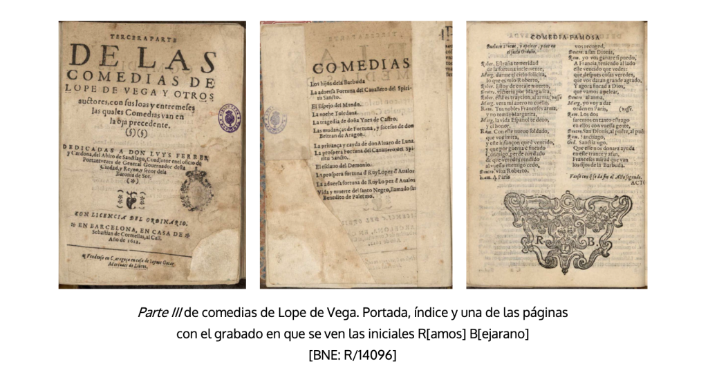 Una atención especial merece la Parte III, cuya portada dice haberla impreso en Barcelona Sebastián de Cormellas en 1612. En ella encontramos un adelanto bien expresivo de problemas que afectarán a otros volúmenes de teatro a lo largo del siglo. La rareza que primero salta a la vista es la escasez de comedias que realmente son de Lope: con seguridad solo le pertenecerían La noche toledana y Las mudanzas de Fortuna y sucesos de don Beltrán de Aragón; porque, a pesar de que tradicionalmente se ha considerado que es suya también Vida y muerte del santo negro Rosambuco de la ciudad de Palermo, con el principal argumento de que se le atribuye en el encabezamiento de esa edición, y de que en el Peregrino de 1618 se cita el título de El santo negro, un reciente análisis de estilometría lo rechaza (Vega 2021a, 100-101), lo que explicaría también las dificultades de Morley y Bruerton de proponer una fecha (1968, 393). Las otras peculiaridades del volumen las descubrió Jaime Moll (1974b), quien, advertido por su mala calidad, impropia de Sebastián de Cormellas, y de las coincidencias en los preliminares con los de Doce comedias famosas de cuatro poetas naturales de la insigne y coronada ciudad de Valencia (Valencia, Aurelio Mey, 1608), terminó dando con el autor de la fechoría: el impresor sevillano Gabriel Ramos Bejarano, que dejó pruebas muy claras al estampar en distintas páginas un taco xilográfico con sus iniciales que utilizaba en sus ediciones «legales». A falta de comedias de Lope, se valió de otras de dramaturgos relacionados con Sevilla o Andalucía: Vélez de Guevara, Salucio del Poyo, Grajales o Mira de Amescua, cuyos nombre hace constar en los encabezamientos.